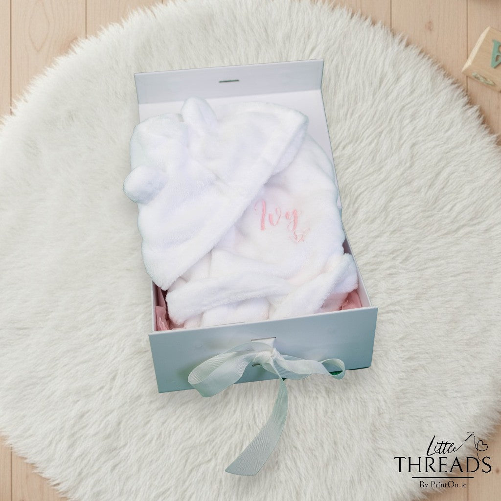 Our fluffy white baby robe is a best seller in our embroidery range and comes in 0-6 months, 6 - 12 months, 12- 18 months & 18 - 24 months. Available in white with baby pink or baby blue stitching complete with name & baby feet or heart detail front and back. Our fluffy robe comes in a personalised keepsake box and is a beautiful gift for newborns, christenings, first birthday or just because..... <3