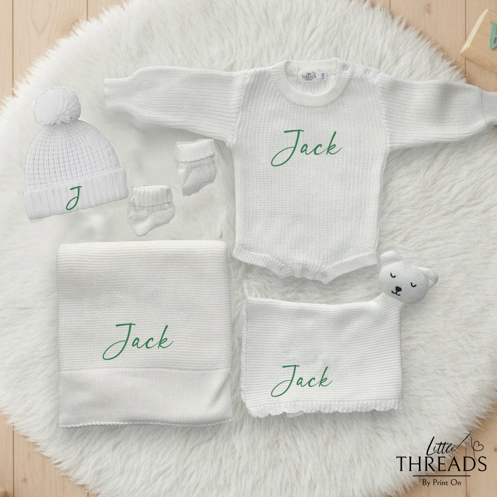 Our Little Threads Signature Set is the ultimate keepsake treasure. With a beautiful button romper, booties, a bow OR beanie, blankie & lovey all in white with choice of colour stitch, snuggled in to a luxury memory box.