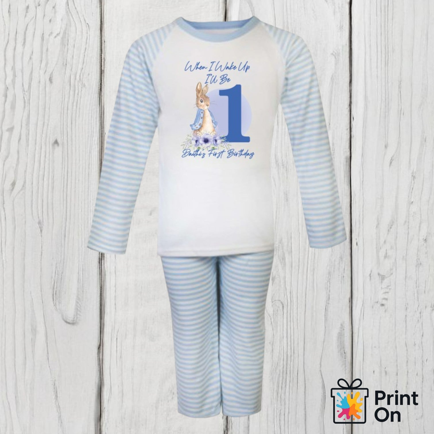 Our best selling When I Wake Up I'll BE ONE PJs are available in STRIPEY or CLOUD pattern with your chosen design. Available in pink or blue age 1-2 years only - we have various designs all custom made <3