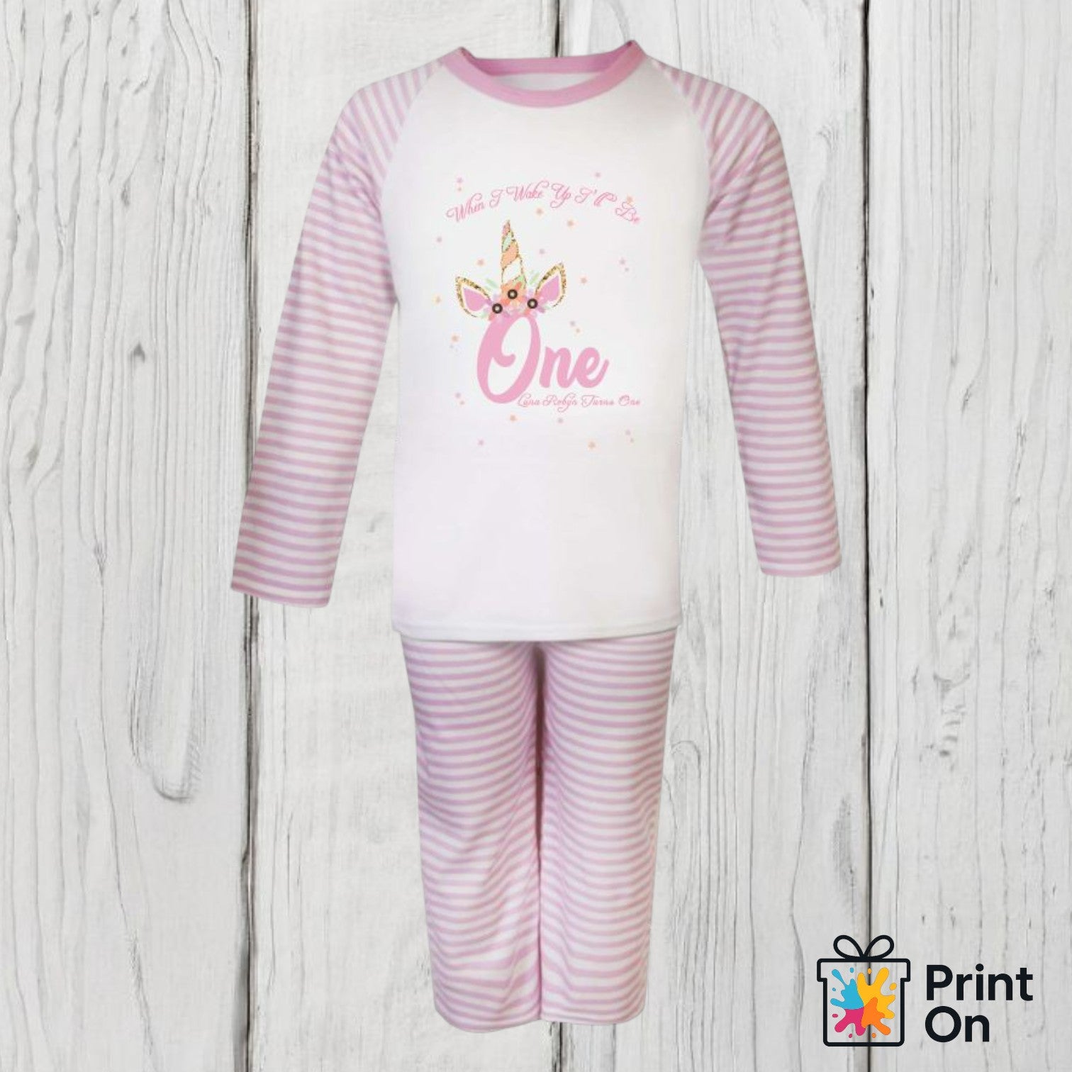 Our best selling When I Wake Up I'll BE ONE PJs are available in STRIPEY or CLOUD pattern with your chosen design. Available in pink or blue age 1-2 years only - we have various designs all custom made <3